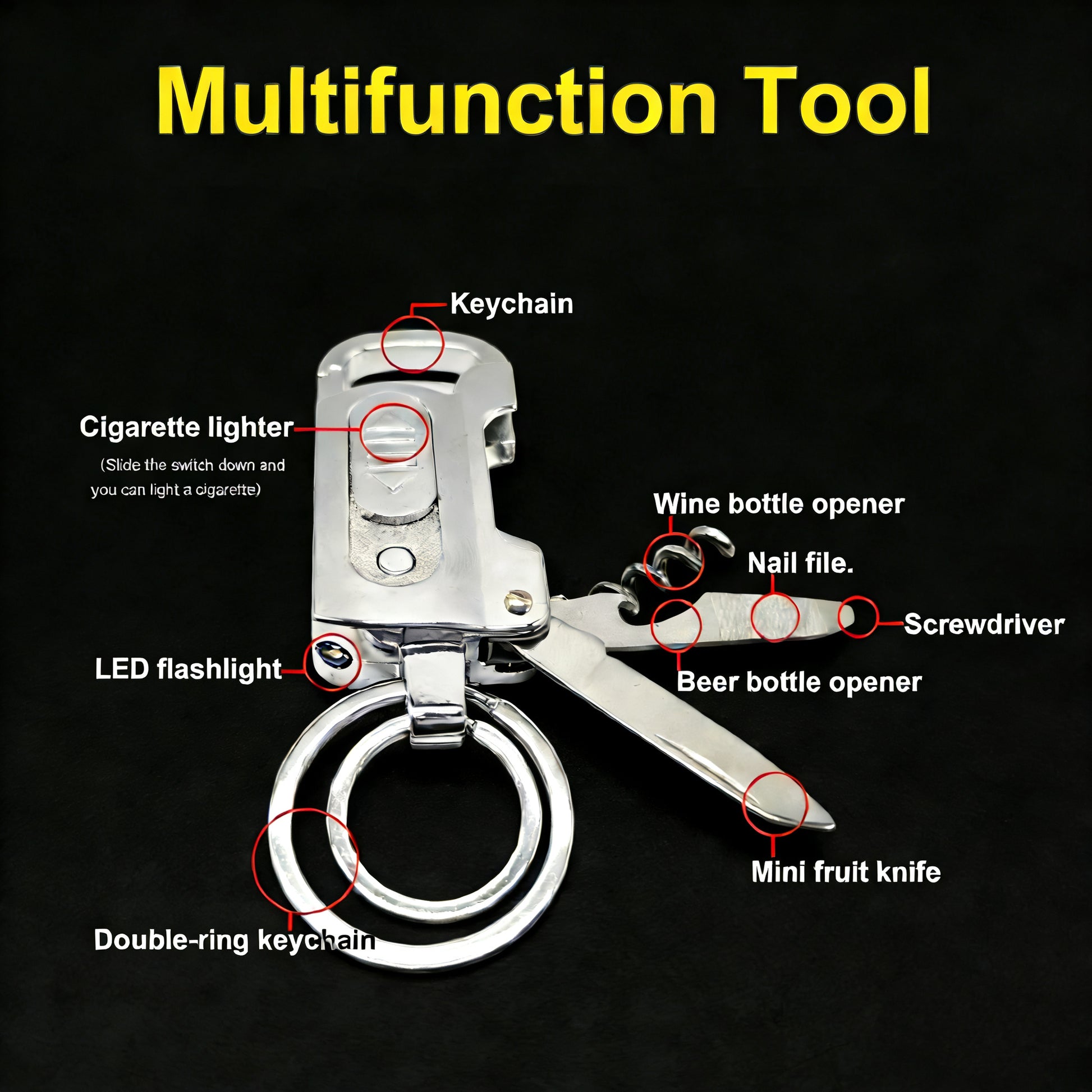Multi-function Keychain with Cigarette Lighter, LED Flashlight, Nail File, Knife, Bottle Opener , Flathead Screwdriver